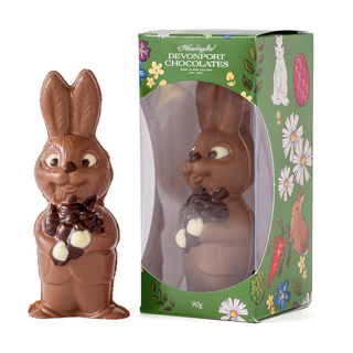 Our ever popular hollow chocolate bunny handmade and decorated in milk, dark and white chocolate.