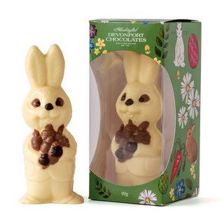 Our ever popular hollow chocolate bunny handmade and decorated in milk, dark and white chocolate.