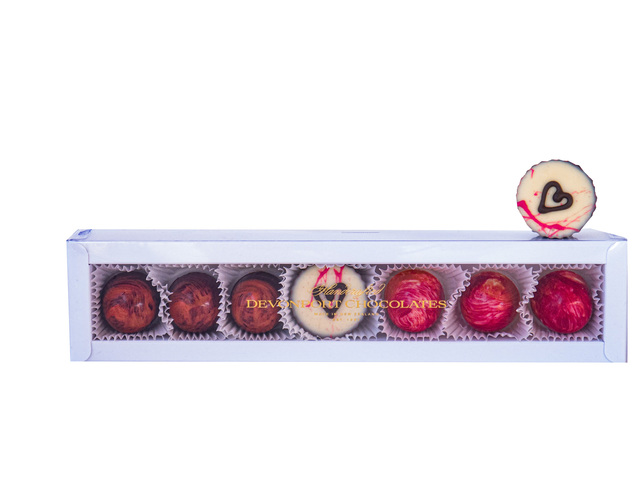 A delicious selection containing a luscious strawberry almond heart chocolate cup and 3 each dark almond créme domes & white strawberry créme domes.
